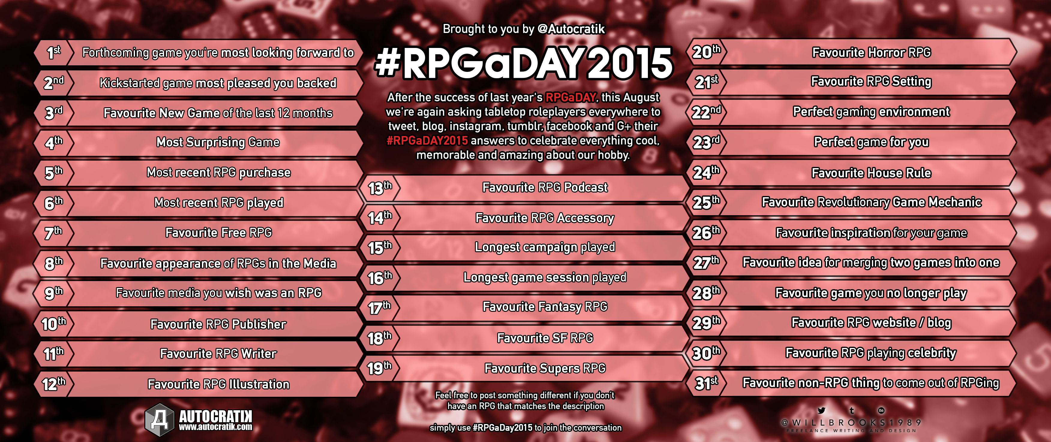 This year, I’m going to attempt to jump in on the RPGaDay ( #rpgaday2015 ), a month-long attempt to get gamers talking to each other about games. This is the brainchild of David Chapman, over at Autocratik. Here’s the subjects in the chart below, and I’ll try and cover them as best I can (although I’m going to be away on a motorcycle trip for a few days this month.) Readers, commenters, casual visitors — throw in your thoughts in the comments and help make this more successful than just me moving my fingers on keys.