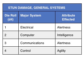 Stun damage is assumed to be minor — blown circuit breakers, crashed computers, cut electrical lines or hydraulic hoses — stuff that can be fixed quickly (in a matter of a round or two) or with jury rigging, if the system can be gotten to.