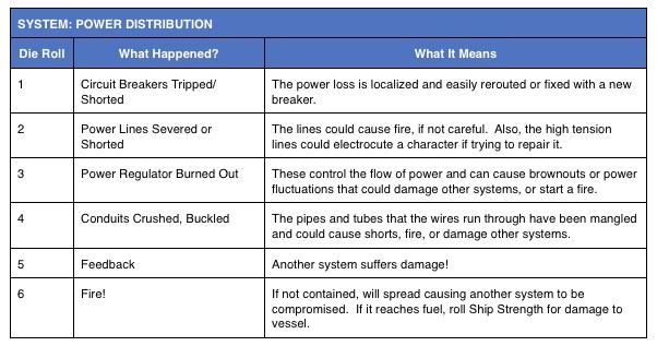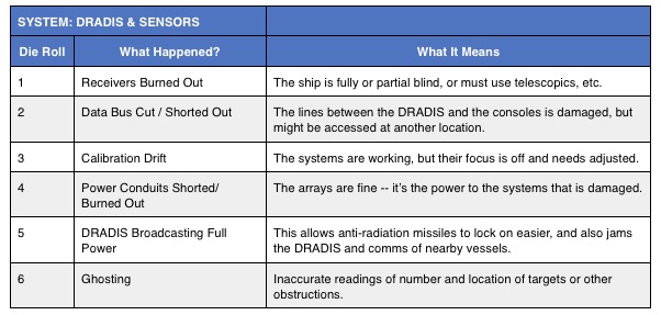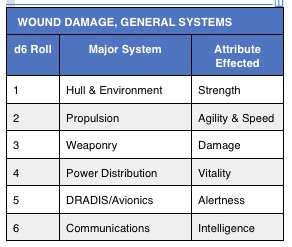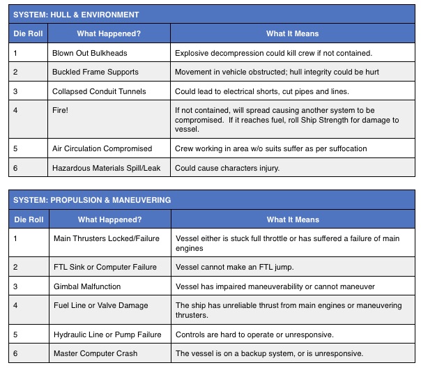The original rules were not designed to address how damage could effect the performance of a vessel. To give players a bit more “crunch” and provide more flavor here is an alternate, expanded system for damage and repairs. There’s nothing that says the GM has to roll on these tables or use the ideas, but they can provide some guidance for how damage could be handled in a space battle.