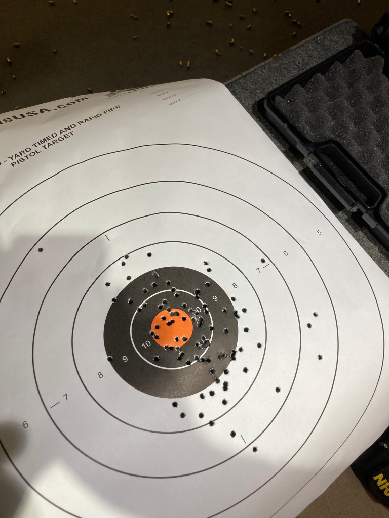 It’s effortless to shoot. There’s almost no recoil, the sights were decent even for low light, and that was with no experience on this platform. The trigger is light — about 4 lbs. using my tip of my finger scale — and resets quickly and with a light audible click. Trigger quality has become Walther’s claim to fame; the WMP lives up to it. A few of the flyers were me double tapping too quickly from the muzzle blast.