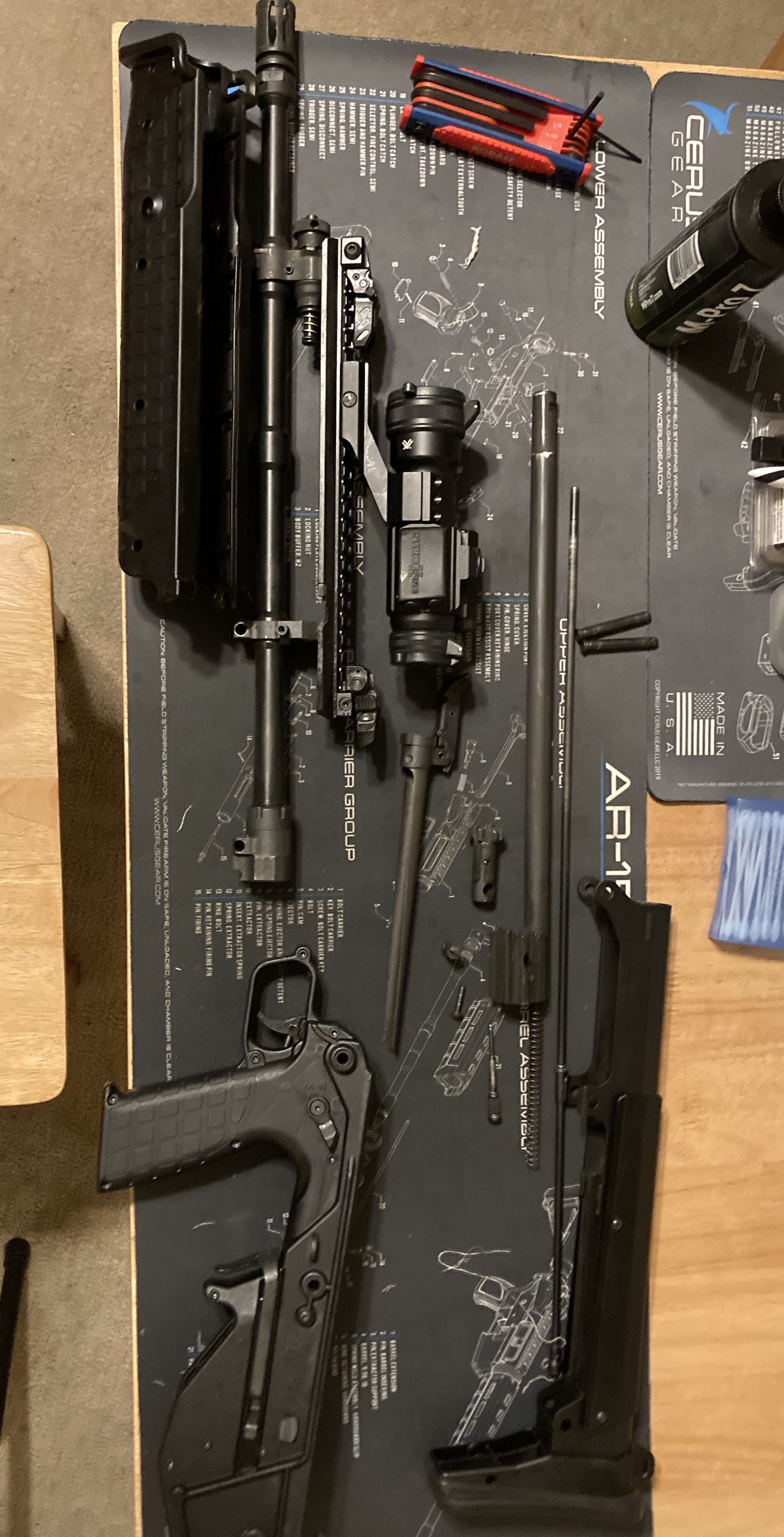 The weapon is dead simple inside — a bolt assembly that sits around the piston rod. When it fires, the bolt travels to the back on the weapon and drops the spent round through an ejection port behind the magazine before traveling forward to pick up the next round.. It expected this to be a point of failure; I was wrong. The trigger on bullpups is usualy awful. The RDB has a smooth pull with a bit of take up and a 5ish pound release. It’s as good as most out of the box ARs. The gas system is easy to access and adjust. There’s a couple of sling points on the front of the handgrip, on the top of the buttstock, and two points on the sides of the receiver/grip assembly. There’s a Pic-rail on the top for optics and flip up sights. I added a pair of UTG cheap pop-ups that worked without adjustment, and the Strikefire off of my AR pistol that needed a lot of drop on the point of aim to get sighted in.