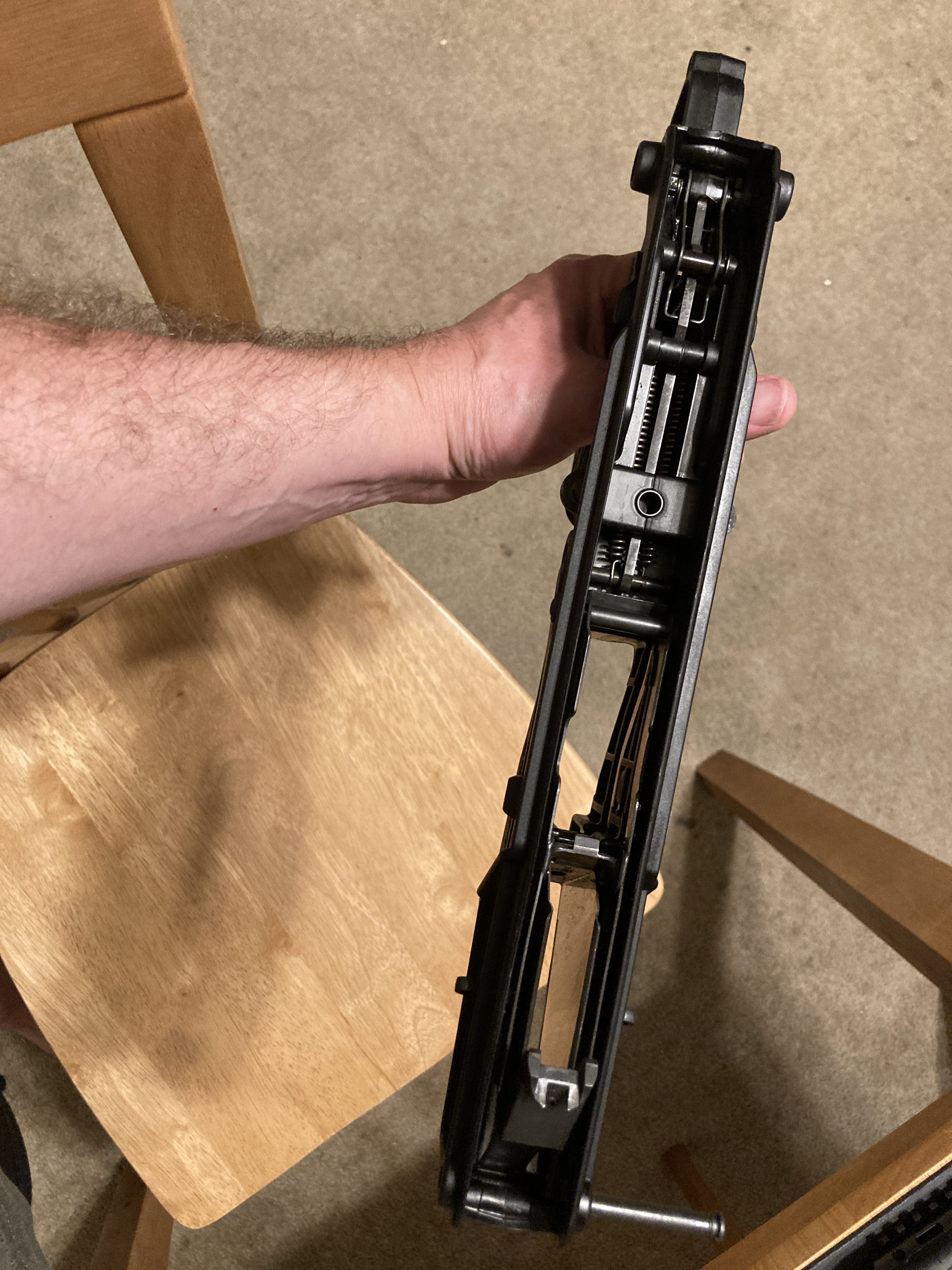 Takedown is simple. Two pins release the grip/receiver, from the barrel assembly. Pull the barrel assembly up a bit, or rotate the grip down and the barrel and bolt assemblies come right out. Putting it back together is just as easy, although sometimes getting the bolt face to lock requires a bit of wiggling. Wear over the thousand plus rounds has been minimal on the finish of the bolt and other friction points. Kel-Tec did a good job on this thing.