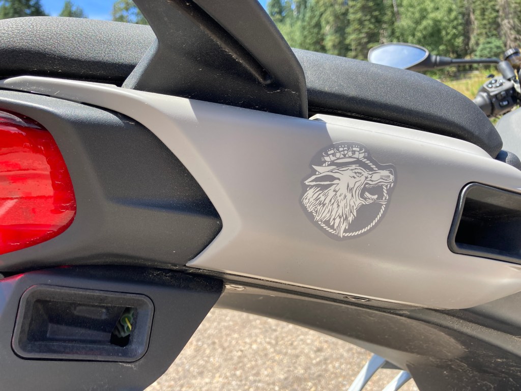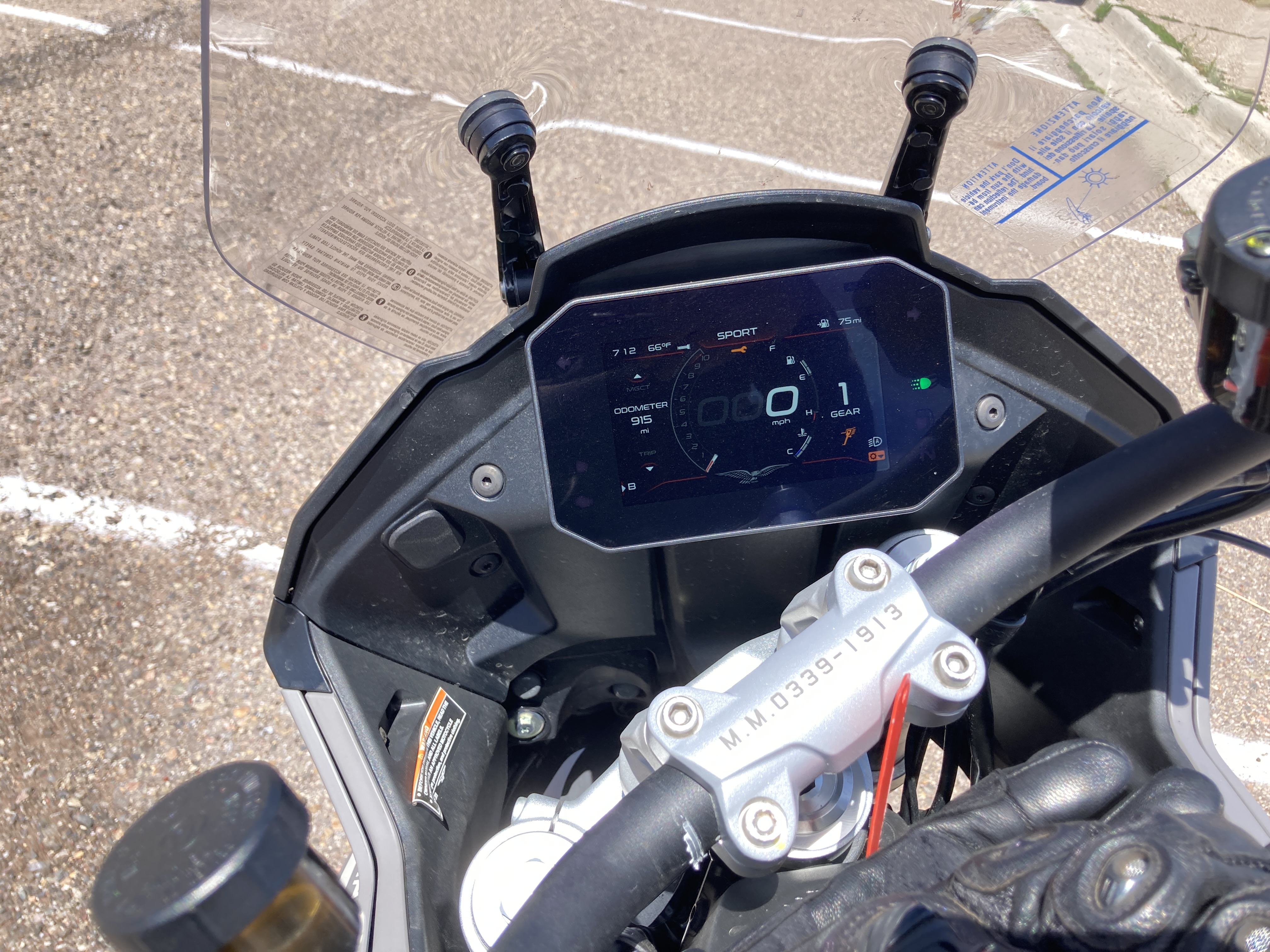 With all that aside, how was it? It’s very comfortable. I spent just over an hour and 70 miles in the saddle, riding in heavy street traffic here in Albuquerque, on the interstate, secondary highways, and the challenging mountain twisties of Sandia Crest road. The saddle is superb — I’d easily put it against any other sport touring bike for comfort. It’s a wee bit tall for folks under a 32″ inseam, but I had no problems getting on and reaching the ground at stops; getting off was a bit more challenging. I kept catching on the hand/top box rails.