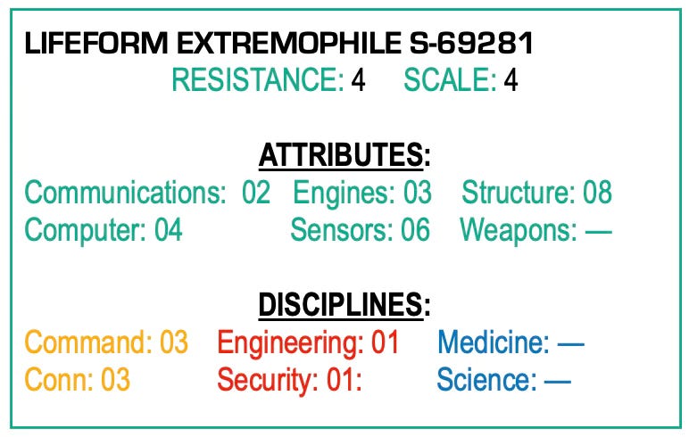 The team’s communications and scans will attract the attention of the creature’s immune system and they will be aggressed by some kind of critter — an ameboid like thing with tentacles/cilia. It’s main target is the repeaters (the radiation is being deemed a threat.) Reason or Insight+Medicine or Science, Diff 1 to realize there is something about the repeaters the creatures are responding to. It will attempt to eat them. Using phasers will be an Escalation 2 and will bring more immune response.
