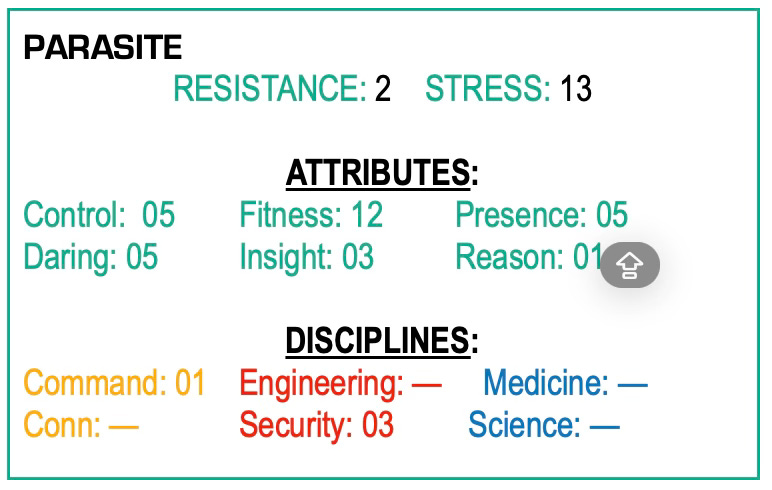 Exploring the interior will require a Control or Daring+Conn, Diff 2. The Spacewalk trait knocks this down to Diff 1. As they explore, a Insight+Science or Medicine, Diff 2 to note there are areas of damage — the walls of the corridors have collapsed exposing musculature and vascular material. A spider-like creatures is appears to eating the damaged tissue, like a maggot, then excreting material to “fix” the damage. A momentum spend or second test using Reason to determine it’s either had some form of disease or injury. With a +2 momentum spend — it’s damage. It looks like something has eaten its way through the flesh? If they scan — or have the ship scan — the creature, Insight+Science or Medicine, Diff 3 to locate the reason: the creature has some form of parasite. It’s a nematode of some sort, but big — ten to twenty meters long.