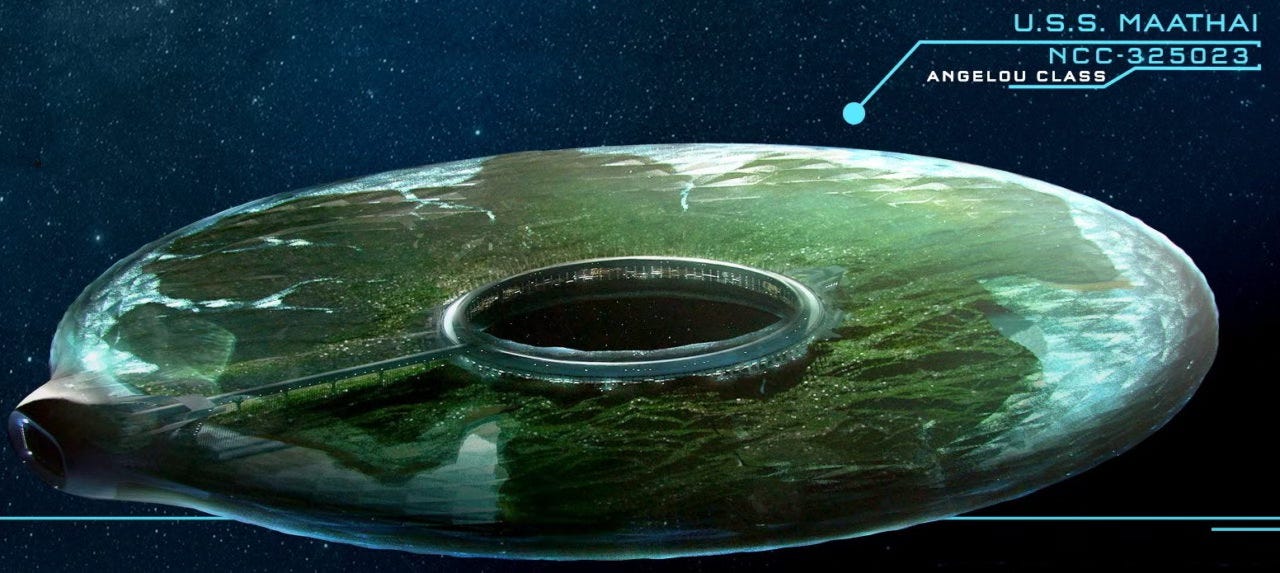 Easily the best thing about Star Trek: Discovery has been their willingness to throw caution to the wind on designing starship. Even more than the (at the time) eye-popping redesign for Enterprise-D in The Next Generation, Discovery has not been shy about pissing off fans and swinging for the aesthetic fences. One of the cooler vessels of the 3rd Season of Discovery is the Angelou-class starship. Described by Ensign Tilly as “a flying rainforest”.