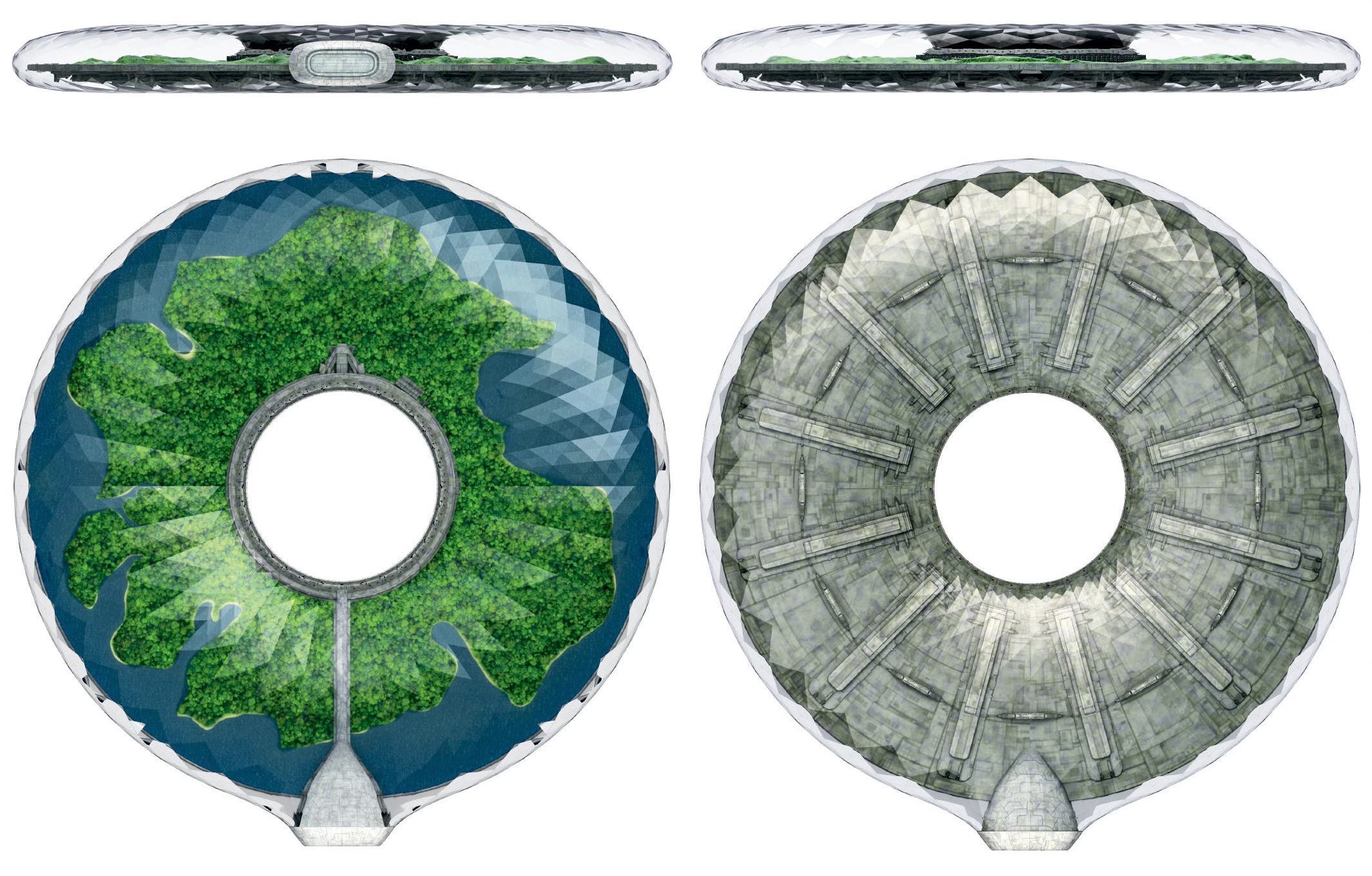 It’s obviously gigantic. A toroidal shape, it looks like the ventral side is the “ship” — the portions with crew areas, life support and gravitational creation, and the like. There is a forward (?) area on the left side of the image above. Is that the command areas? Crew quarters? Deflector dish or is this the back section with an engine? There is a “bridge” over the biodome that takes up much of the ship’s interior space. Judging from the vessel, it’s a good ten decks or more. Essentially, the Angelou-class is part spaceship/part space station. The central area around the donut hole would be massive — 50ish decks top to bottom. Include the biodome itself, you’re probably talking living space that would rival or exceed that of Spacedock One.