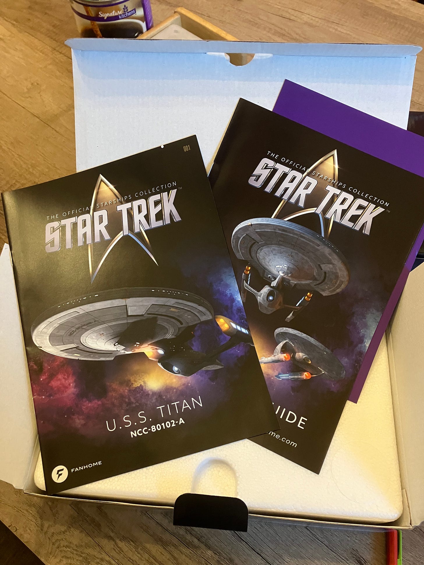 They delivered. My first Fanhome starship, the XL(ish) Constitution III-class U.S.S. Titan-A. So how do they compare to the old Eaglemoss stuff? Packaging is nice — good quality cardboard with styrofoam insert to protect the model. Art design is more colorful and attractive than the fairly bland blue with model picture of the Eaglemoss days.