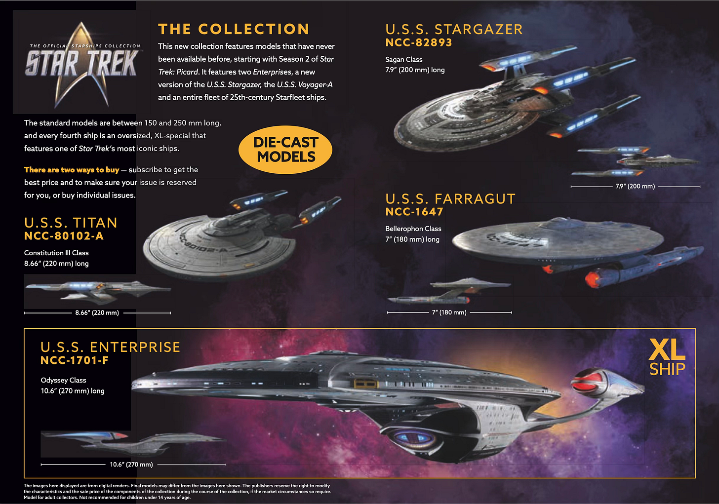 About the size: Titan is just a hair shorter of 9” long. Compared to similar XL ships from Eaglemoss, 8-9” was the small ships; some were a foot in length. There will be non-XL sized vessels, and the advertised Enterprise-F is just shy of 11” stem to stern. There are going to be “normal” sized models and XL, a la Eaglemoss, it looks like.