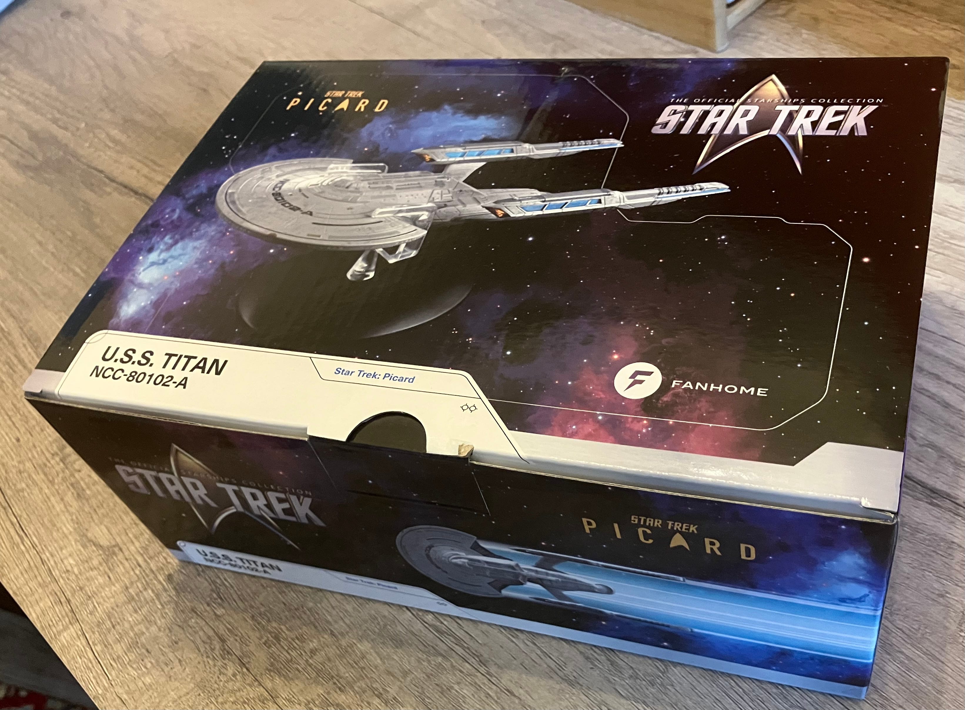 They delivered. My first Fanhome starship, the XL(ish) Constitution III-class U.S.S. Titan-A. So how do they compare to the old Eaglemoss stuff? Packaging is nice — good quality cardboard with styrofoam insert to protect the model. Art design is more colorful and attractive than the fairly bland blue with model picture of the Eaglemoss days.