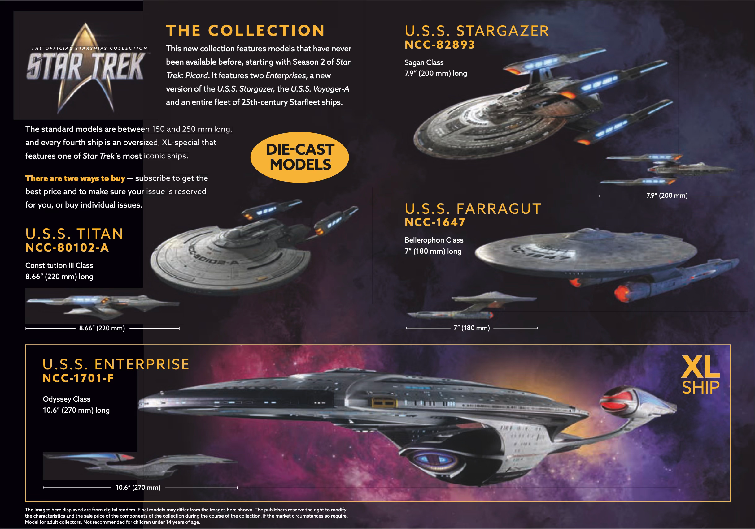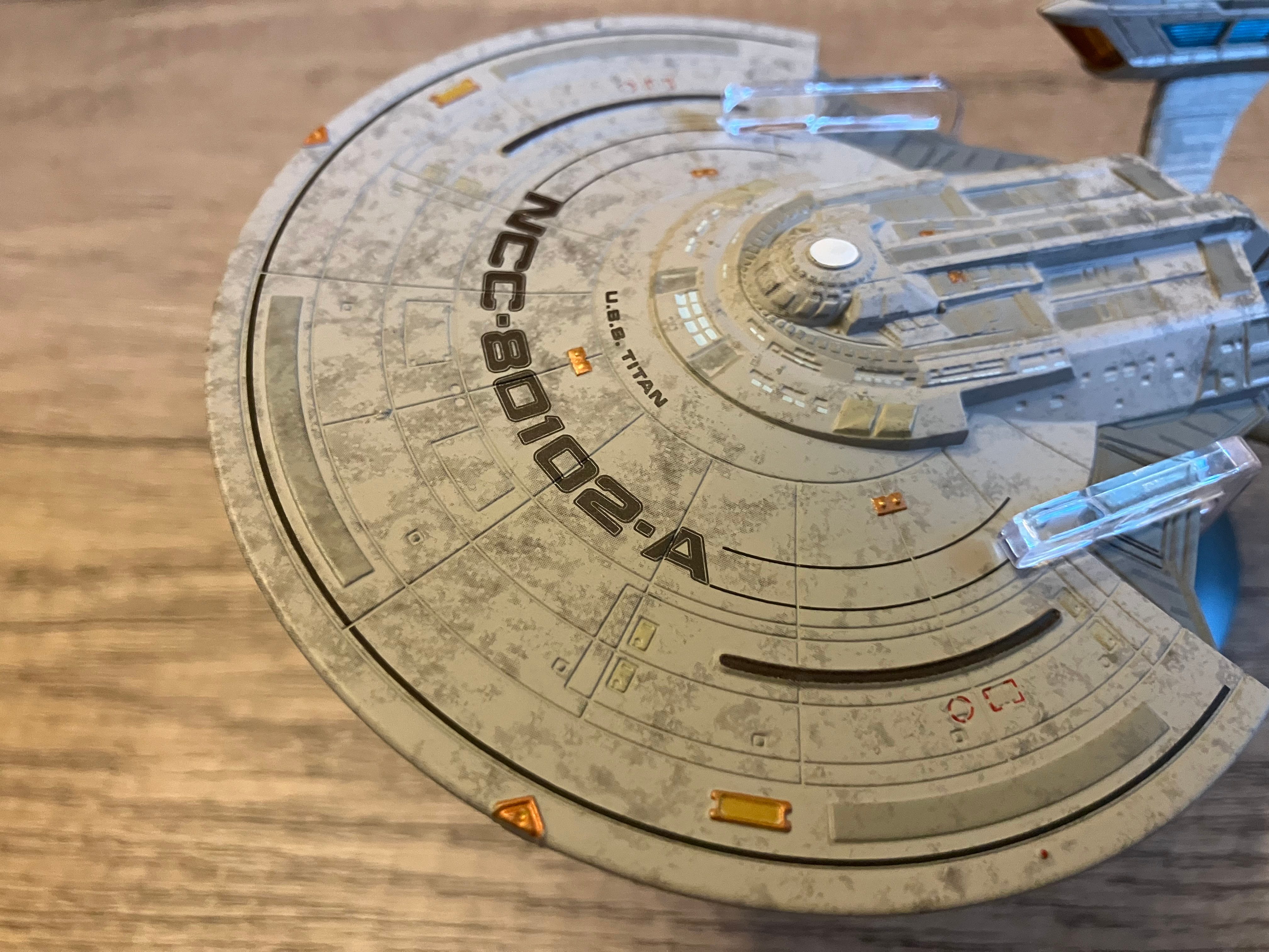 About the size: Titan is just a hair shorter of 9” long. Compared to similar XL ships from Eaglemoss, 8-9” was the small ships; some were a foot in length. There will be non-XL sized vessels, and the advertised Enterprise-F is just shy of 11” stem to stern. There are going to be “normal” sized models and XL, a la Eaglemoss, it looks like.