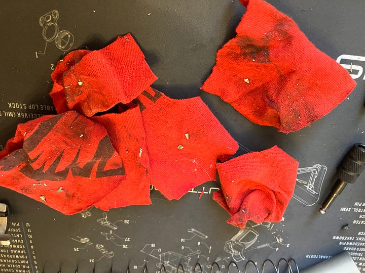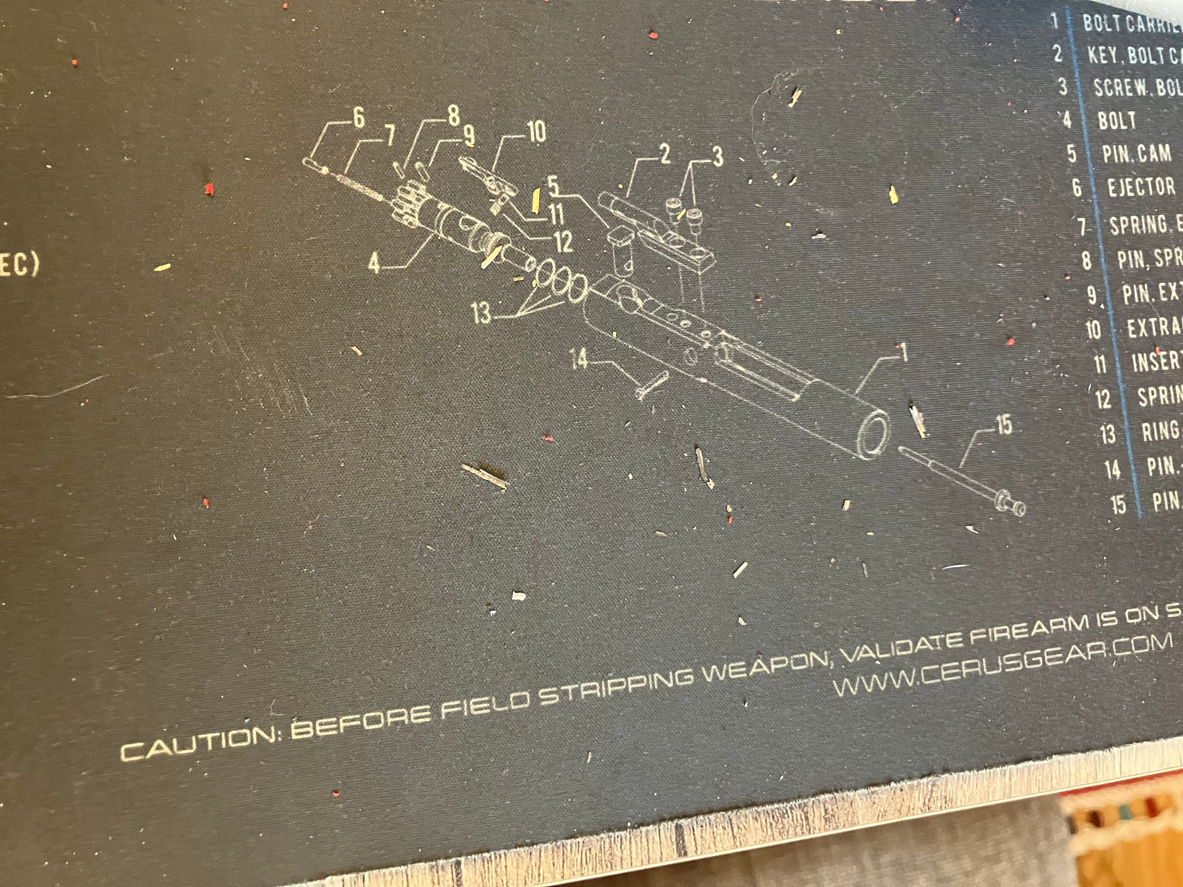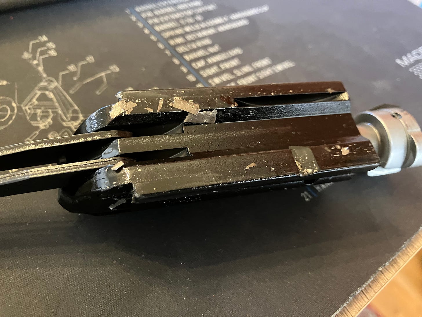 After half an hour of cleaning I had a nice collection of metal filings and had to go over the cleaning mat twice just to get rid of the bits. I even vacuumed the floor under my seat. And once I was done and oiled the weapon…? More shavings.