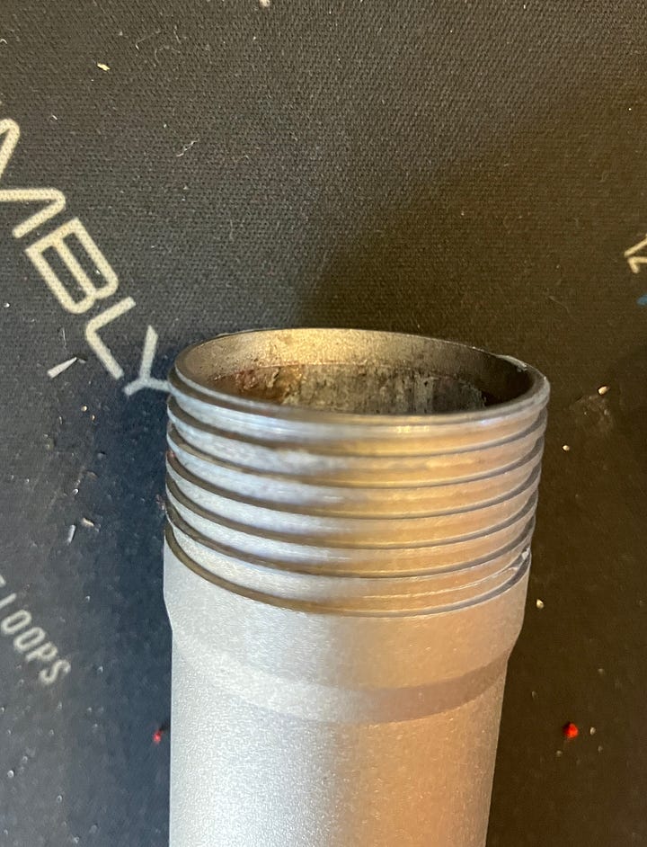 So far, so good. As usual, when I got home, I started cleaning the weapons, starting with the MAC 2. First thing I noted was that the magazine tube really didn’t want to unscrew. I also noticed a bunch of aluminum shavings from the threads and there was some damage from the brace that holds the mag tube and barrel. It had worked it’s way forward a bit during firing.