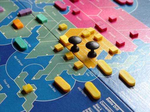 The first stage is initiative. Everyone rolls, the highest goes first. If you roll a 1, you get an “event” card which can add a bit of spice to the game — my first event threw a bunch of Nazi troopers across the board. Next is movement: you roll in turn a d6 and move up to that number. The map board is broken up to allow fast travel, save across the ocean; there is a alternate rule that allows you for a certain bit of glory chips to fly from a major city to a major city. If you stop at a spot without an artifact to hunt, you can draw an event or have to fight a bad guy, depending on a die roll.
