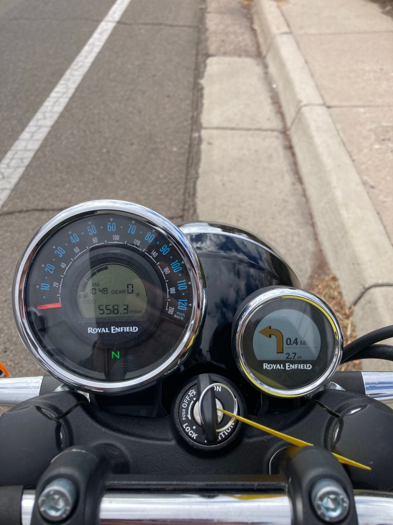 The saddle is wonderful. It does demand you improve your posture, you heathen; slumping was gettign me right in the tail bone, but when I sat up, it became an all-day saddle. The bend in my knees (I’m 5’8″ish) was perfect, feet on the pegs at the arch, just a little bent forward to reach bars, with my arms relaxed. I could easily see touring about on the V7. In comparison, the T100 Bonneville is comfortable in just about any position — I think with the Bonnies, the seat’s a tie. Even with the touring saddle, it’s loads better than the Enfield. Compared to Thruxton’s bench-like seat, or the MK Design brat saddle I have so I can have a matching chrome seat cowl..? It’s luxurious.
