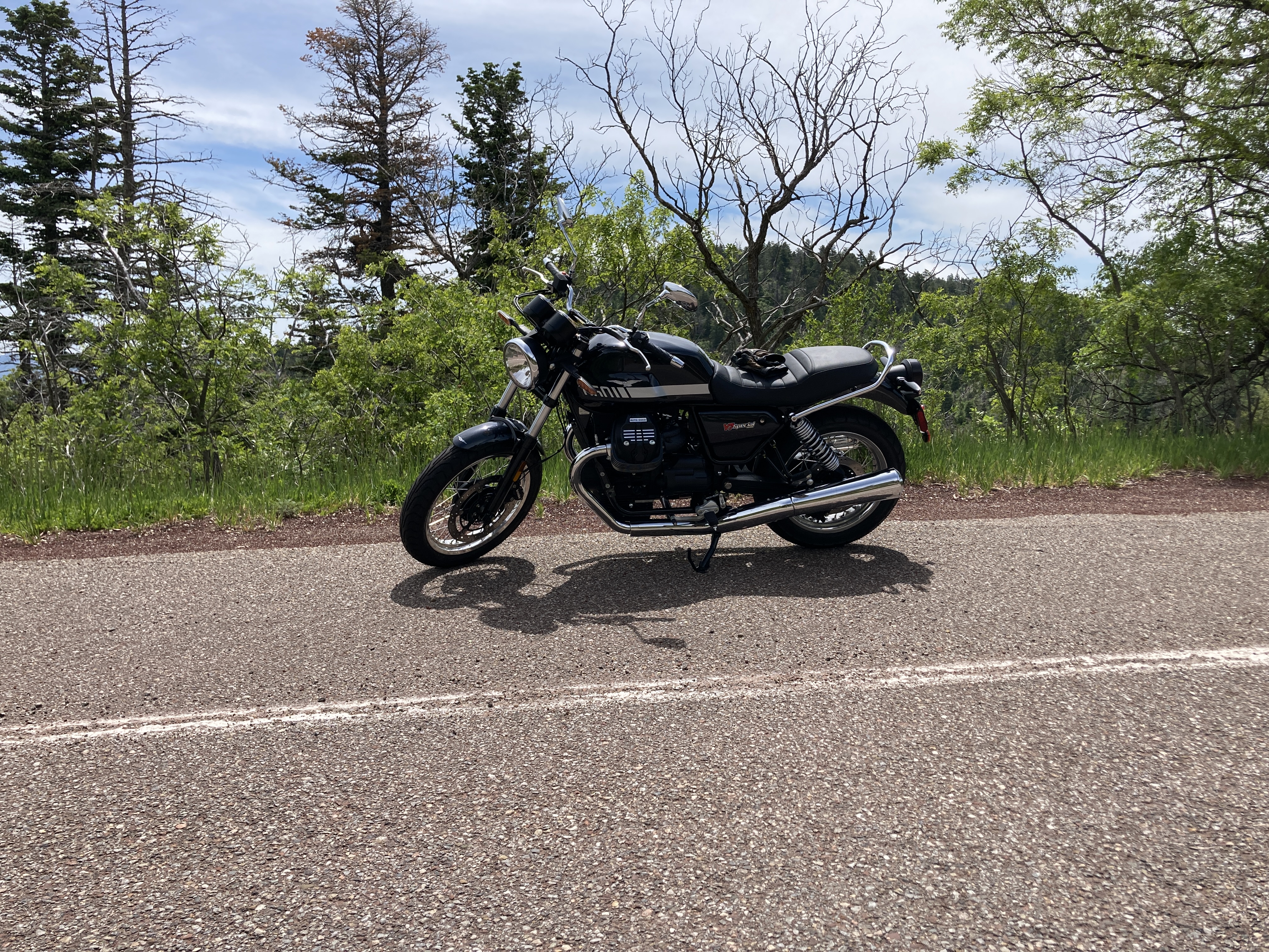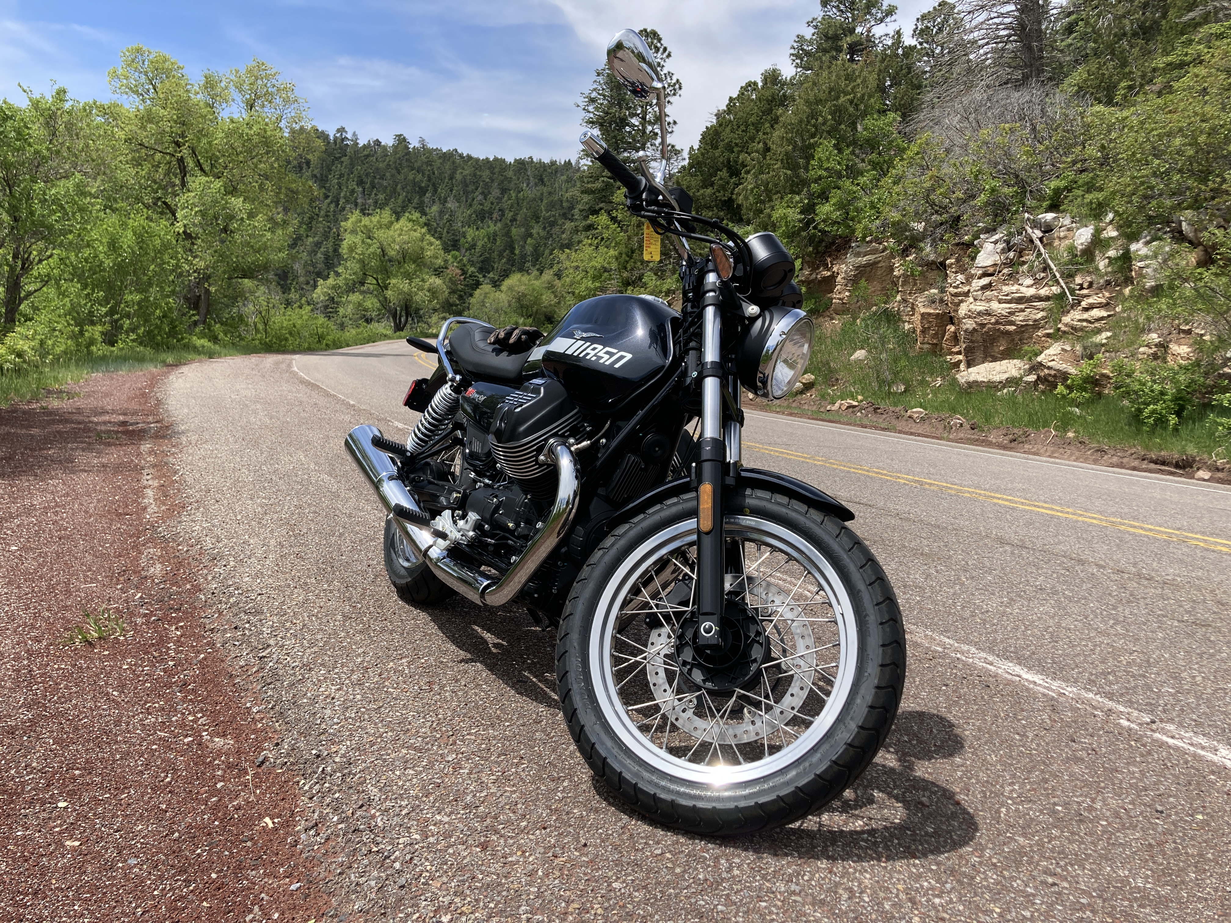 I had the V7 out for a little over an hour and rode 50 miles — in town traffic, highway, and some fairly tight twisties on the Sandia Crest Road. It puttered about the city with no issues. Changing lanes was as simple as shrugging my shoulders in the right direction. On the highway, it was similarly good. Carving the canyons, however, is where I started to run into the V7’s limits. I’ve ridden this road countless times with a number of different bikes, and on the first good long hard right hand turn, I ran into a slight issue. When you hit the throttle, the transverse twin wants to lean to the right…and it did. This lead me to scrape the pegs and my toe in a place I’ve never hit before. I got similarly close in a few of the other turns, nicking the toe of my boot where normally, I’d have clearance.