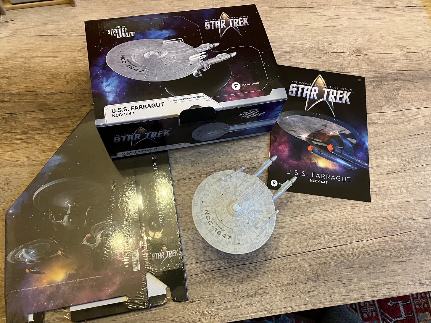 So far, Fanhome has been doing right by me on their starship collection. I didn’t suffer through the Christmas time lag on the second model like some folks did. According to the US Fanhome guys, there was a missorting and the models are (as of this writing) on their way. The third drop was the one I was waiting for: the new USS Farragut from Strange New Worlds. I’ve been digging the Discovery/Strange New Worlds aesthetic for the outside of the ships, and I was hoping this one would be up to snuff.
