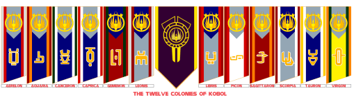 The tribes settled on twelve worlds some distance away. The tribes’ namesakes and icons originally corresponded to the twelve signs of the ancient tribes, although these names drifted over time. The early Colonies lived (and fought) more as sovereign nations. Some (particularly Caprica) prospered, while others (such as Sagittaron and Aerilon) were often considered lessers. By the time of the First Cylon War, the population of the colonies was about 46 billion people. Forty years later, it is about 36 billion. (This is my attempt to reconcile the 20 billion and 50 billion numbers quoted at various times in the series. The original 12 billion was ludicrously low for 12 worlds, in my opinion.)