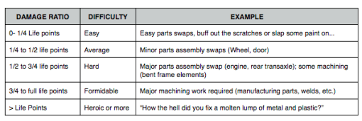 The repair rules for vehicles and ships in the Serenity and Battlestar Galactica RPGs uses the same idea as healing wounds for a character — appropriate, in some ways, as vessels are treated as characters by the rules. However, not all vehicles are equal…a motorcycle might have 8 life points, as opposed to a car with 12 or 14…a 5W crash seriously impedes the operation of the bike; the car has some pretty nasty body work and maybe some mechanical repairs necessary, but it’ll still get you to Dubuque, if you need.