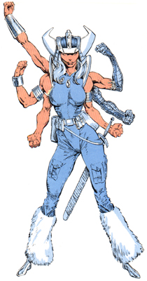 Rita was a successful stuntwoman nicknamed Ricochet Rita when she encountered the being known as Longshot, a genetically engineered slave of another dimension ruled by the monstrous Mojo and leader of a rebellion there. Rita helped Longshot, falling in love with him in the process. At some point, Rita was abducted by Mojo’s agents and abducted to his universe. There, she became, Spiral a slave-hunter for the Spineless Ones and the the property of Mojo. To ensure Spiral’s hatred of other humanoids, Mojo had Spiral designed with six arms rather than only two and gifted her with the ability to wield magic.