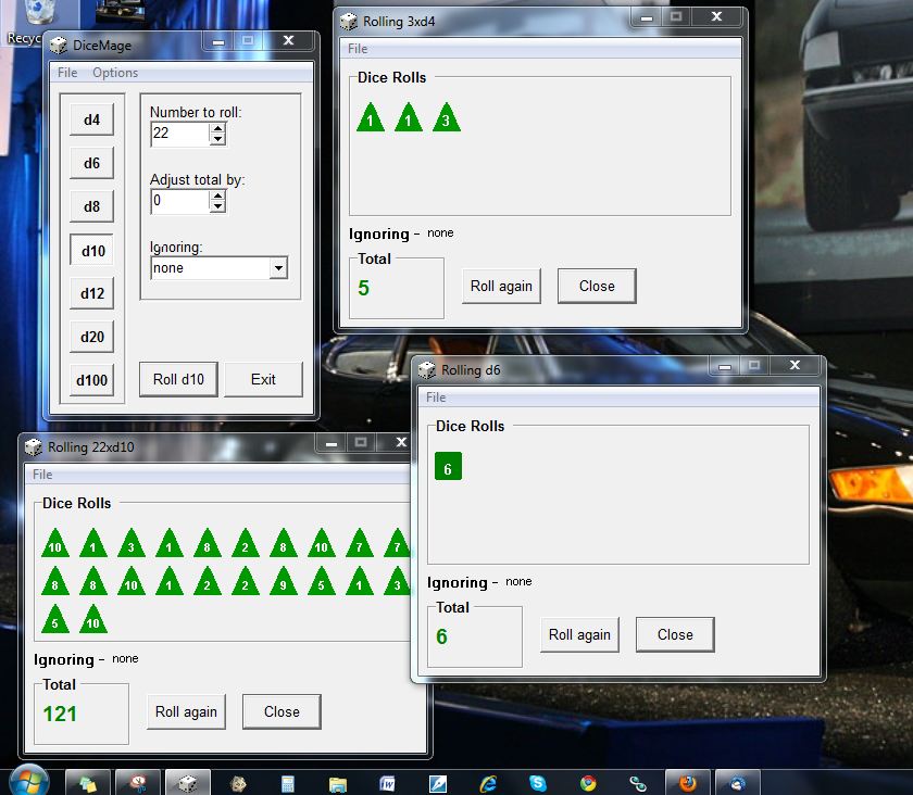Dice Mage is a tiny program that can run on most Windows platforms you might be running…unless you’re reall antiquarian and running Win95 or earlier. You can get it here. It’s maybe a 1mb file and runs quickly and smoothly with not hiccups on every machine I’ve had. You can conceivably roll up to whatever number of dice you need; I’ve never rolled more than 20 at a time (for Hollow Earth Expedition…) Who knows what those WEG Star Wars fans firing off a broadside from a stardestroyer could get enough dice rolled…but it would be lighter than the wheelbarrow of plastic you’d need to bring to the game.